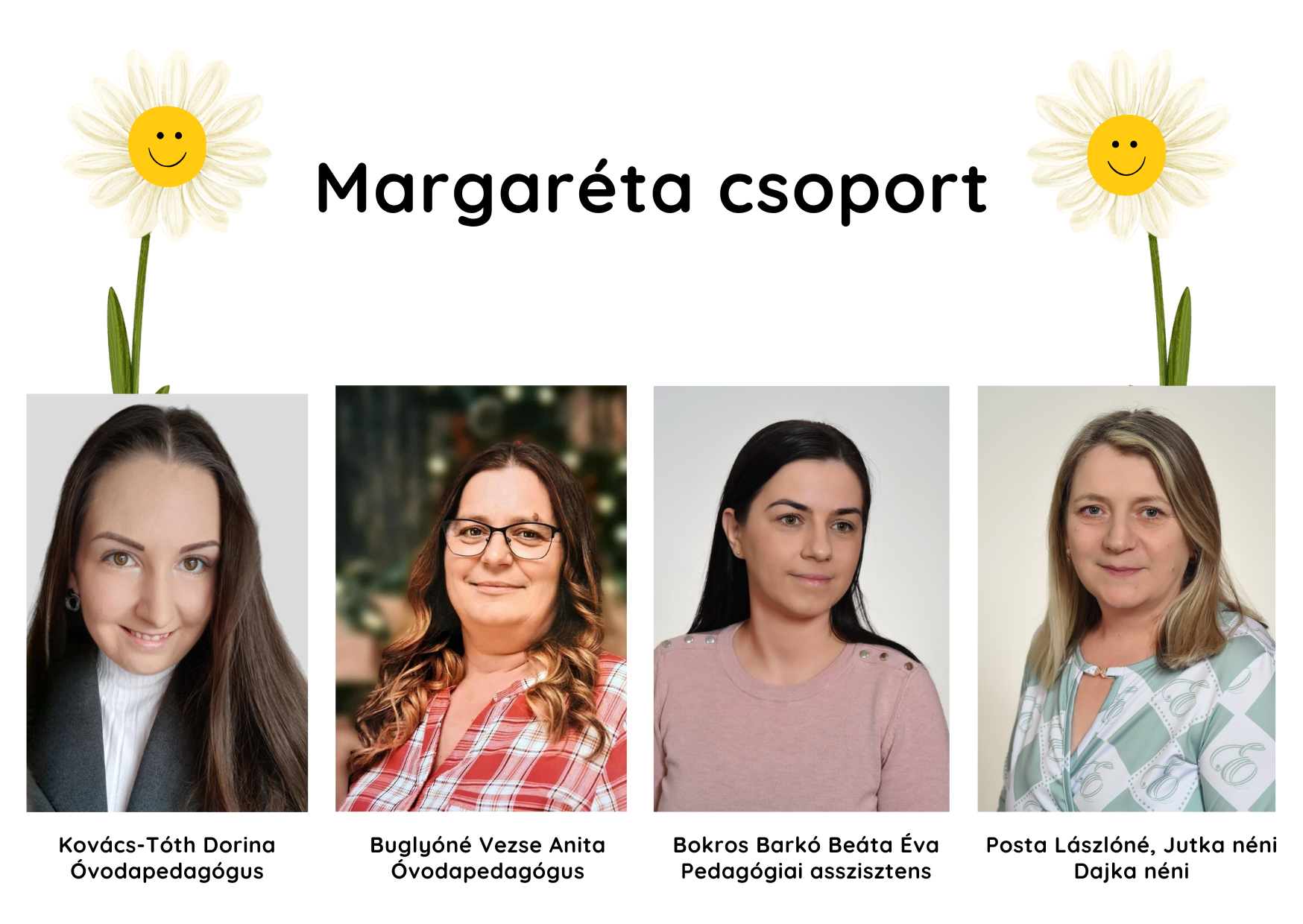 Munkánkat fejlesztőpedagógus, gyógypedagógusok és logopédus segíti. Közös értékrenden alapuló, tudatos nevelőmunkával gondoskodunk a gyermeki személyiség kibontakoztatásáról. Gazdag tárgyi környezettel vesszük körül a gyermekeket, fő profilunk a családokkal való együttműködés és a mozgásfejlesztés.